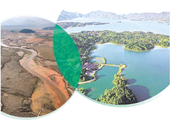 桂林灵川青狮潭水库库区管理站平时对青狮潭水库的水面活动、库区等进行管理。据该站阳副站长介绍,公平乡的水库消落区的土质含有铁矿石,但是含铁量很低,在上个世纪曾进行过铁矿开采,大家看到的大坑是当时采矿留下的。出现红色也是因为土质含铁的缘故。绿洲则是藻类繁殖所致。