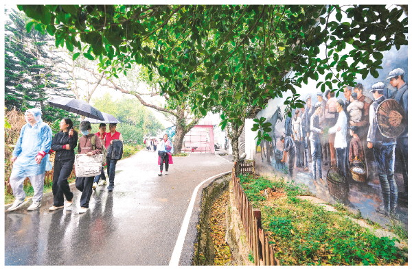 “重走长征路”队伍走过九屋镇甘草村,墙绘上村民送别红军的画面仿佛再现。