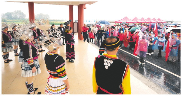 在九屋镇甘草村,村民载歌载舞欢迎“重走长征路”队伍的到来。