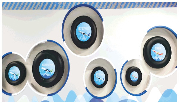 在桂林蓝宇展厅里,展出有多种规格的民用航空轮胎。 记者徐莹波 摄