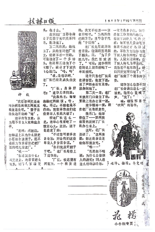 图④:桂林日报刊发作品《两瓶五粮液》,这也是钟毅首篇见诸报端的文字作品。