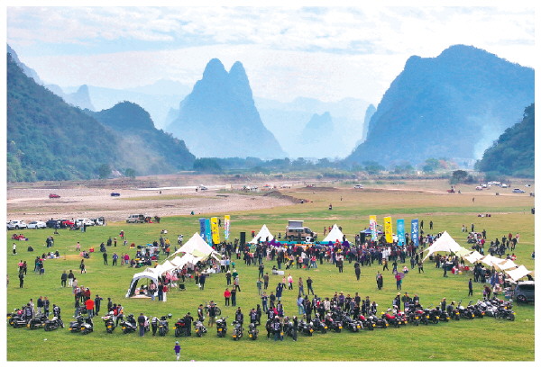 在刚过去的周末,将近12000名游客来到永福县金鸡河水库,在2000多亩自然生长的大草坪上露营、骑行、看演出、逛集市,直到深夜进出水库的道路依旧被车灯照得通明。