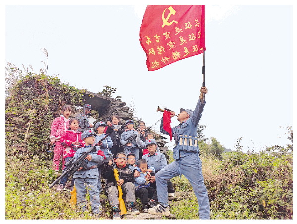 时隔90周年,由小学生组成的一支“小红军”,沿着当年红军长征的足迹,由江底乡龙塘村寨子头抵达马堤乡东升村。一路上,这支“小红军”不怕困难,进行了“征粮征兵”、埋锅造饭、火把夜行军、CS阵地对垒战等军事化体验活动,将爱国爱党之情从小根植于心。图为12月8日“小红军”在东升村当年红军经过的石门前进行集结冲锋角色扮演。