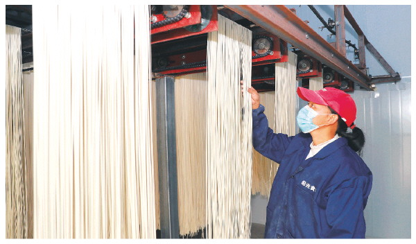 ▲12月4日,灌阳县黄关镇东阳村的面条食品科技帮扶车间内,工人正在赶制面条。 记者李忠波 摄