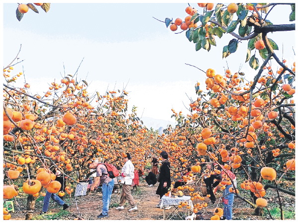 ◥在“柿长家”柿子园,游客如织。 兰臻 摄