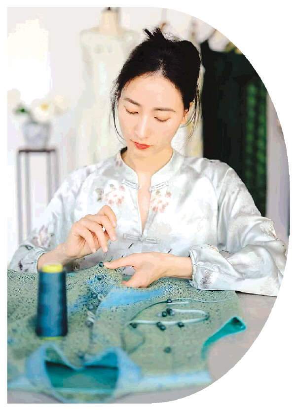 韦一告诉记者,在给“歌仙”设计服装时,她面临着如何融洽地将色彩丰富的壮锦与简单高级的服装设计相结合的挑战。经过多次尝试,她最终通过在服装的门襟、袖口和裙子飘带上巧妙点缀壮锦,得以实现既高级又具有民族特色的服饰效果。