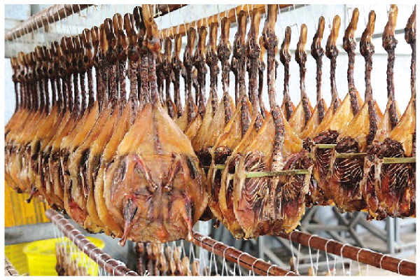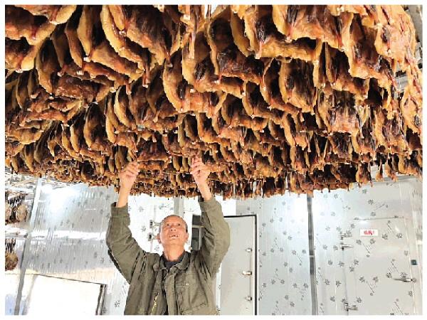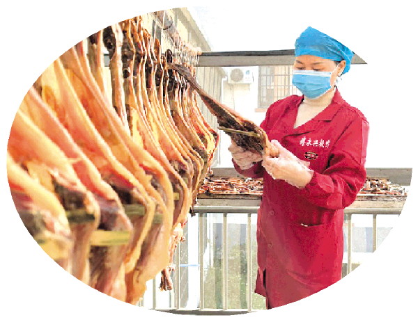 不仅如此,近年来,旧村村民在传承中不断创新,在制作传统板鸭的基础上,开发了骨脆可嚼、韧劲醇香的腊鸭翅膀、腊鸭下巴、腊鸭肾、腊胸脯肉和鸭脚包等新产品。