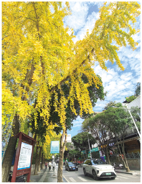 临江路的银杏叶变成金黄色。