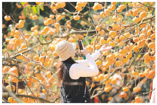 ▲恭城月柿丰收的景象引来游客打卡拍照(李茂香 摄)