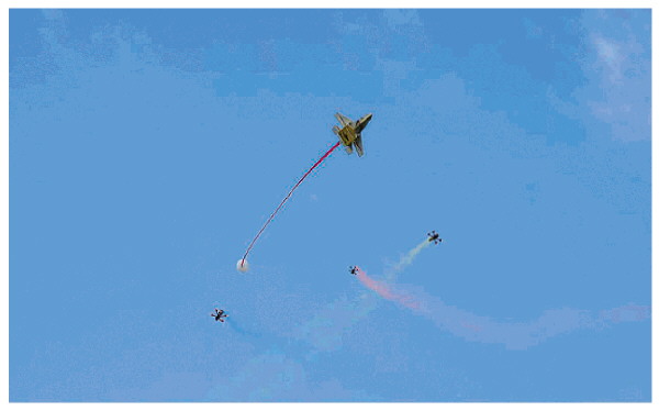 ▲图为表演项目“穿越机空中打击气球”,即穿越机依靠自身螺旋桨,利用高速飞行产生的强大冲击力,精准地对气球实施打击。 记者李思静 摄