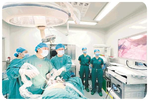 ▲医院内科、外科、介入科、五官科等科室设施齐全,以综合实力为后盾,具有“强专科、大综合”特色。图为综合外科主任周辉生在为患者实施腹腔镜微创手术。