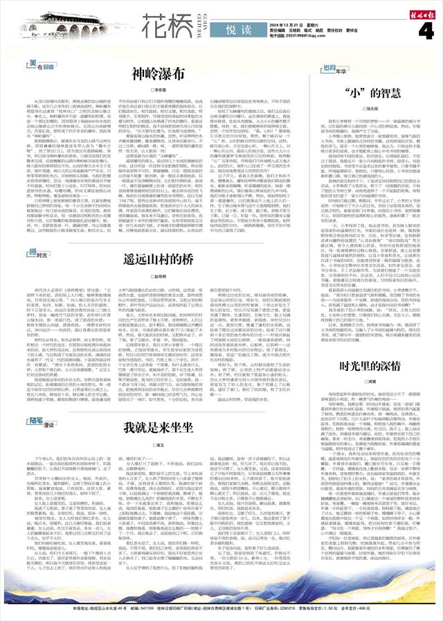 唐代诗人孟郊在《洛桥晚望》里写道:“天津桥下冰初结,洛阳陌上人行绝。榆柳萧疏楼阁闲,月明直见嵩山雪。”向人展示的是古代冬天的美景,如诗、如歌、如画,给人无尽的遐想。时下正是冬天,而远在龙胜各族自治县三门镇大罗村,却是一幅现代气息的冬景:动车穿行在青山绿水间,那一条银白色,成了流动的风景;一排排木楼依山而建,错落有致;一湾碧水穿村而过,奔向远方……而此时,最让我难忘的却是家乡的桥。