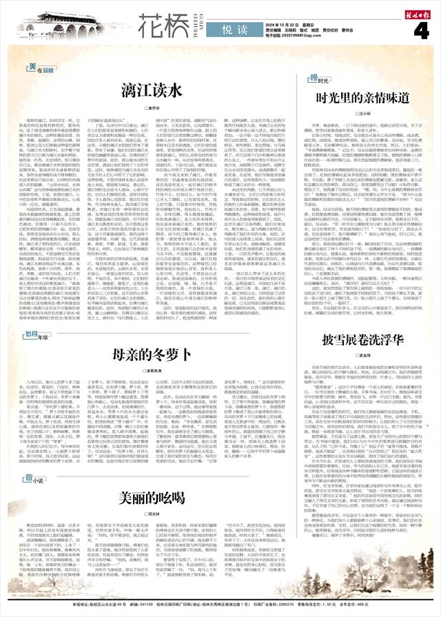 冬日漫长,但有母亲的冬萝卜相伴,日子便不再寂寞。那碗滚烫的萝卜汤、那碟咸香的萝卜干、那道香甜的萝卜酿成了我心中最柔软的部分。母亲的冬萝卜不只是餐桌上的佳肴,更是人生旅途中的一剂良药。它教会我不管世界多么复杂,只要保持一颗质朴的心,就能找到属于自己的宁静与幸福。于是乎,在漫漫冬日,我也像母亲一样,到集市上挑选萝卜回家,根据家人的口味喜好,炖汤、炒肉、腌制……让热乎乎的萝卜汤温暖家人的整个冬季。