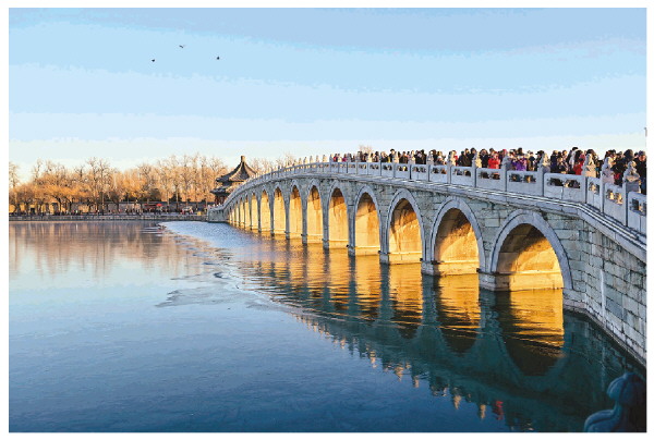 这是12月17日在颐和园拍摄的“金光穿洞”景象。每逢冬至前后,北京颐和园十七孔桥便会上演“金光穿洞”的自然奇观。 新华社记者李鑫 摄