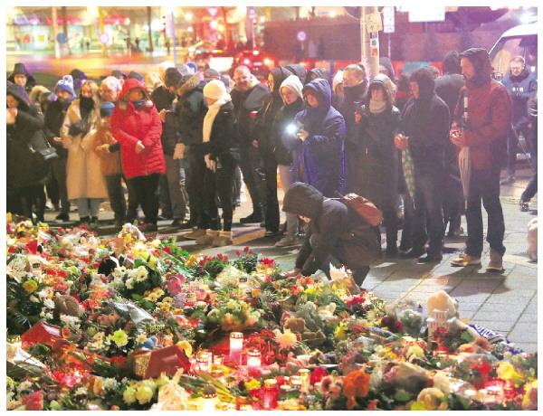 12月21日,人们在德国马格德堡悼念圣诞市场遭袭击事件遇难者。