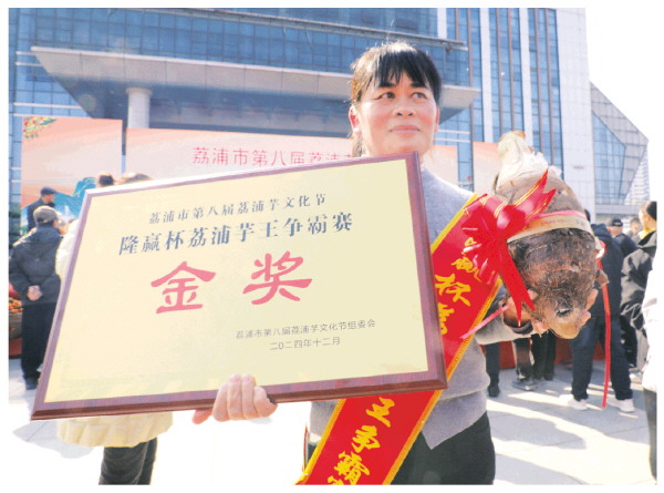 荔浦芋金奖获得者骄傲地展示芋王。周俊远 摄
