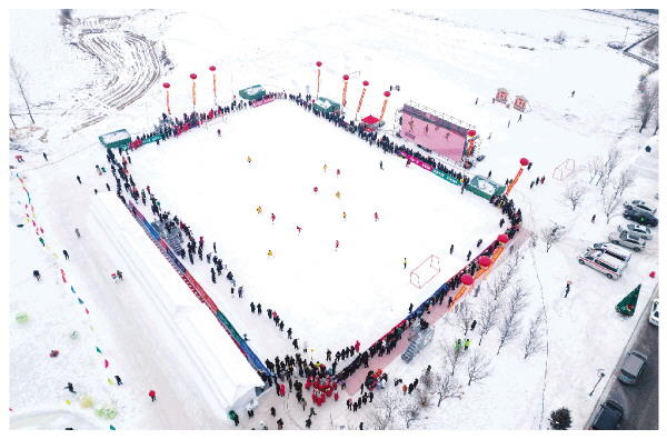 这是12月23日拍摄的南北乡村雪地足球邀请赛比赛现场(无人机拍摄)。