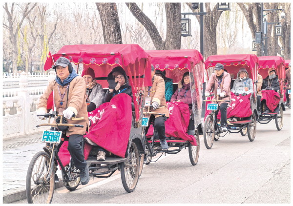 12月12日,外国游客在北京什刹海乘坐人力三轮车观光。