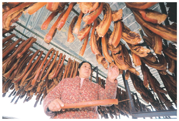 瑶古妹腊肉店加工厂的工人仔细检查腊肉熏制情况。