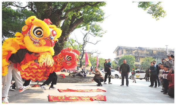 1月5日,秀峰区庙门前村人和堂龙狮团的师徒们在村里阳太阳广场开始舞狮训练,为即将到来的春节做准备。据负责人介绍,每年春节期间人和堂龙狮团都会在村里以及市区的景区景点表演舞狮舞龙,为市民和游客带去新年祝福。图为舞狮训练时吸引了不少游客观赏。