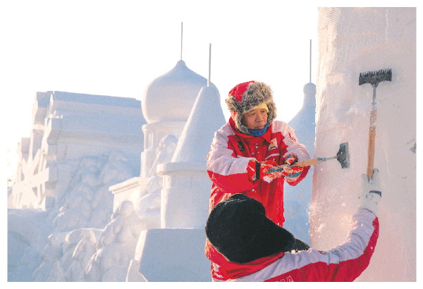 1月6日,参赛选手在哈尔滨太阳岛雪博会园区进行雪雕创作。