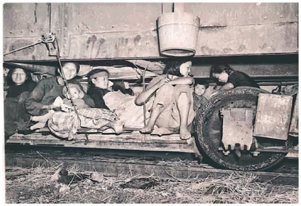 图②:流亡的民众拖家带口,勉强挤在火车车厢与车轮之间的狭窄空间里。