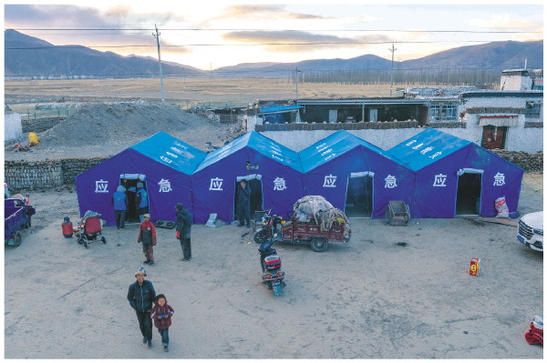 1月7日,在拉孜县曲下镇土林村,受灾群众搬入应急帐篷(无人机照片)。新华社记者 姜帆 摄