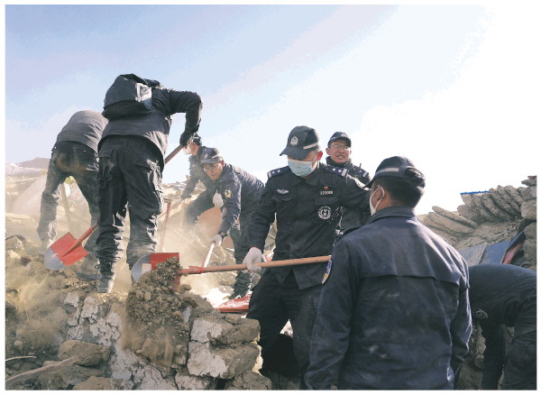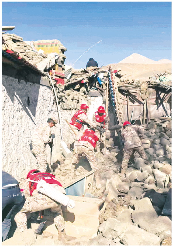 1月7日,救援人员在定日县长所乡古荣村进行搜救。新华社记者 晋美多吉 摄