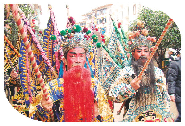 桂北民间的村民低调内敛,习惯把各种艺术形式称之为“灯”。舞龙舞狮称“龙灯”“狮灯”,彩调桂剧渔鼓等地方戏曲唤“花灯”。上演灯会时,村里都张贴有红纸黑字的请柬——“是夜金角老黄龙到贵村出游胜景,恭贺贵村人丁兴旺,万福全安。”“是夜花灯小曲到贵村迎春献艺,恭祝府上老少安康。”桂剧中喜庆吉祥,常在过年上演的剧目,当数《穆桂英挂帅》和《将相和》,前者为女将穆桂英率领众多杨家女子征战沙场,气氛热烈欢快,后者讲廉颇与蔺相如不辱使命,和好如初,共同保卫赵国。在桂北,除平乐县、灌阳县盛行桂剧表演外,临桂区义江流域内的中庸镇、五通镇、六塘镇等地也有众多“桂剧粉丝”。过去,商人彭万隆独自筹资金建造“彭家剧院”,专用于桂剧表演。后“彭家剧院”因故被毁,桂剧表演改在工商管理所大院里。鼓乐喧天,长袖飘飘,刀枪剑戟的桂剧,一直都是居民们的文化大餐。