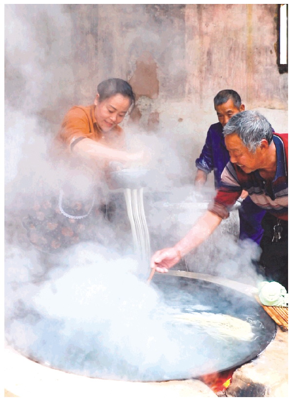 冬日的清晨,寒气有些刺骨。新街镇青箱村保存完好的清代古民居群还笼罩在薄薄的晨雾中。不过,在其间一座古民居内,已是一派忙碌景象。年逾六旬的村民王继良是该村土法制作红薯粉的行家里手,他正带着几位乡亲分头忙碌。劈柴、生火、烧水、洗锅……四方的天井因这升腾的袅袅炊烟,显得格外温暖和富有生气……