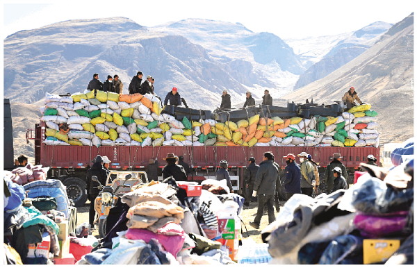 1月9日,受灾群众在措布村卸载救灾物资。 新华社记者李响 摄