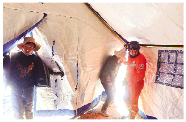 1月9日,救援人员在措布村帮助受灾群众搭建帐篷。