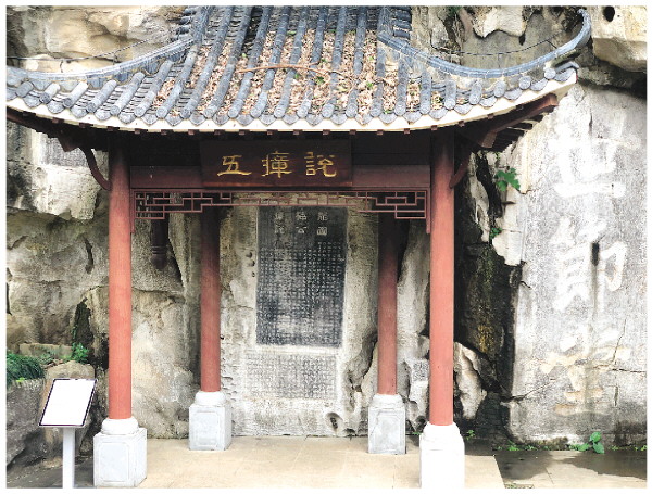 这片碑文被刻在了今天的龙隐岩和龙隐洞之间的石壁上,为保护石刻,后人专门加盖了一座名为“五瘴说”的亭子,突显其特殊地位。从碑文中我们得知,前面“瘴说”部分的作者是梅挚,曾在宋仁宗景祐初年(1034年)任昭州(今桂林平乐县)知州,后面的跋文是朱晞颜所写,而书写这篇碑文的是自称“布衣”的石俛,但此人已不可考。