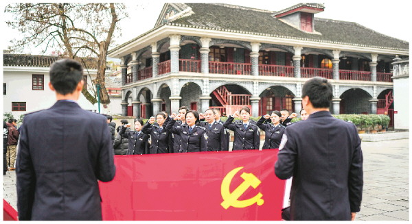 基层民警在遵义会议会址前重温入党誓词(2025年1月7日摄)。 新华社记者 陶亮 摄