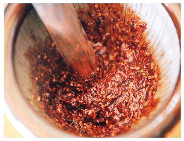 趁着蒸鸭的空当,张立没有闲着。因为,抛鸭的秘制配料,并非仅是塞入鸭膛中的那些。干辣椒、蒜米、子姜片等,亦是必备。其中,干辣椒是灵魂。张立把干辣椒倒入冷油中,再开火翻炒约莫两分钟,接着倒入擂钵中不断擂碎。辣椒中的辣和香,被最大程度地激发了出来。