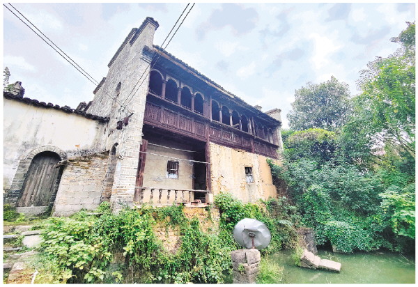 在门楼的对面,一座中西合璧的二层水楼同样吸引了记者的注意,老房临街一面的五山屏风墙上以及邻水一面的二楼阳台,均设有拱形圆弧窗。目前,这座老房仍有人居住,经主人同意后,记者走进其中,发现屋内的木质门窗并没有桂北民居中常见的雕花,但都做成了圆弧拱形,颇有西洋韵味。可惜年久失修,不能登上二楼。