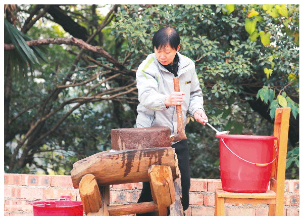 一个已经搁置了数年又被清洗得干干净净的红沙材质石磨,早就被放置在了作坊前的树下。龙秀琼说,在上个世纪,还没有打浆机,家家户户都用石磨磨干豆子,目的是去皮,并以此保证做出的腐竹口感细腻。把事先准备好的干豆子倒入石磨中开磨,记者以为很费劲,没想到很容易就把干豆子磨去了皮。龙秀琼笑着告诉记者,干豆子因没有水分的缘故,所以很容易磨破,也就很容易去皮。不过,要是每天磨20斤干豆子,却是一件既费时又特别辛苦的事。