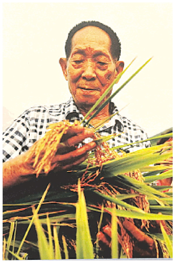 图⑨:在灌阳县黄关镇联德村袁隆平超级稻第四期攻关示范片,袁隆平在查看水稻生长情况。(2013年8月19日摄)