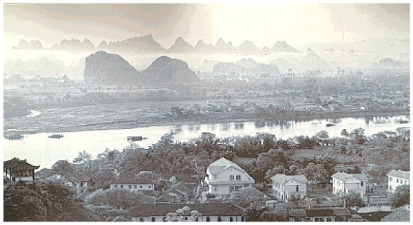 图②:桂林晨曦,远处是屏风山,它好像一座碧玉雕成的屏风耸立在天边。(1962年7月11日发)新华社记者何国正 摄