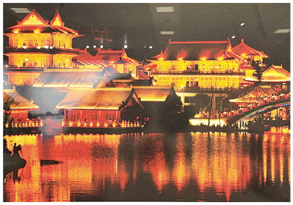 图⑩:2003年9月17日拍摄的桂林木龙湖景区夜景。由桂林环城水系开发公司及旅游管理公司与国内著名的主题公园专家共同策划建设的桂林木龙湖不夜城即将完工,将在国庆黄金周期间对游客开放。木龙湖不夜城集民族风情表演、中西餐饮文化、民间艺术展示、焰火观赏等于一体,是桂林旅游的新去处。