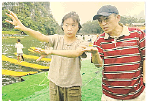 图⑤:2003年8月16日,张艺谋在阳朔漓江演出现场与《印象·刘三姐》山水实景演出导演之一的王朝歌(左)商讨演出布景。新华社记者陈健力 摄