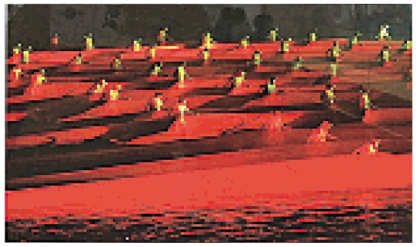 图④:2004年6月30日晚,《印象·刘三姐》百场纪念演出在阳朔举行。这台全球最大规模山水实景演出自2004年3月正式公演以来,吸引了近20万中外观众欣赏,参与演出的600余名演员主要来自沿江。 新华社记者刘宇 摄