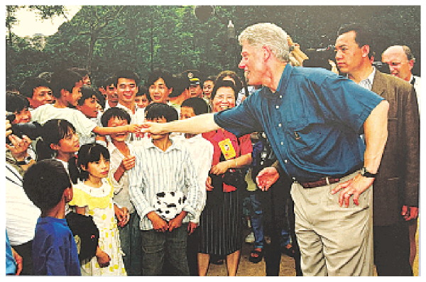 图⑫:1998年7月2日,正在中国访问的美国总统克林顿在广西桂林阳朔县走访了漓江边的兴坪渔村。这是克林顿和渔村的一名儿童握手。 新华社记者陈天湖 摄