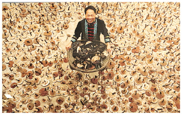 图⑧:2013年7月24日,在广西桂林灵川县大境瑶族乡乐育村委李子根村,村民李乔华在晒芝场展示晒好了的“野”紫灵芝。 新华社发