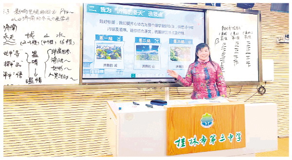 “同学们,你们知道《沁园春·雪》里有多少地理知识吗?”“对了,北国是指地理位置,千里冰封是气候,大河上下是河流,山舞银蛇是地形……”初听时,你会以为这是语文课,其实这是一堂地理课。老师还会打开课件链接Windy气候软件,让同学们实时观察北方的天气和风力变化,用地理思维想象这首诗的意境。这就是桂林市第三中学教师李品仪团队首创的“e+语文+X”跨学科融合教学新模式的场景。