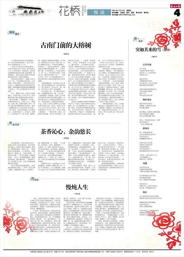 由于逝者已矣,对于曹学佺的问题,只能移情现存这一棵。2019年,《桂林晚报》曾报道,说是广州市林业和园林科学研究院来做过测算,出具的报告显示大榕树的树龄是516年。专家的说法,自有他们的道理。不过,钩沉于古南门往事的人总会提及南宋刘克庄的一首诗。刘克庄生活于公元1187年至1269年,他于1221年到桂林工作大约一年,并写下诗篇《榕溪阁》:“榕声竹影一溪风,迁客曾来系短篷。我与竹君俱晚出,两榕犹及识涪翁。”“榕溪”就是榕湖;“涪翁”即黄庭坚(号山谷道人,晚号涪翁),北宋著名文学家、书法家。黄庭坚生活于公元1045年至1105年,1103年被指斥幸灾谤国、送往宜州管制,1104年途经桂林并在古南门前系舟逗留。《广西通志》记载,黄庭坚路过桂林,系舟在榕树下,后人为纪念他建了榕溪阁。100多年后,刘克庄来到榕溪阁,徘徊榕树下,出于对黄庭坚的景仰写了这首诗,他在诗中懊悔自己出生得晚了,不像系舟处的那两棵榕树能见到黄庭坚。由于年代久远,榕溪阁已不存,今人在湖边造了条仿古小舟,像是在诉说着黄庭坚的漂泊旅程。有人对照刘诗与徐文就联想,刘克庄写的“两榕”是不是徐霞客见到的“两大榕”呢?如果是,那么大榕树的年龄就不止516岁了。