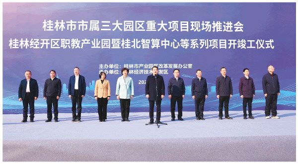 ▲1月19日,桂林市市属三大园区重大项目现场推进会在桂林经开区举行。市委书记、市长李楚出席活动,宣布桂林经开区职教产业园暨桂北智算中心等系列项目开竣工。 记者李凯 摄