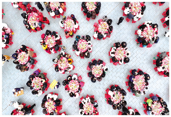 ▼1月18日,四川省泸州市江阳区华阳街道瑞景社区居民在品尝百家宴(无人机照片)。
