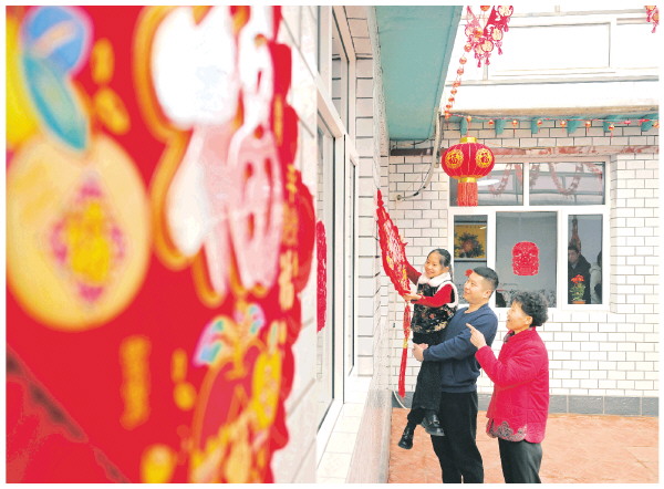 天津市西青区辛口镇第六埠村村民在院子里挂“福”字(2024年2月1日摄)。 新华社记者赵子硕 摄