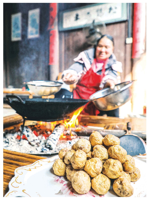 村民正在炸制“无嘴圆子”。 阳海翔 摄